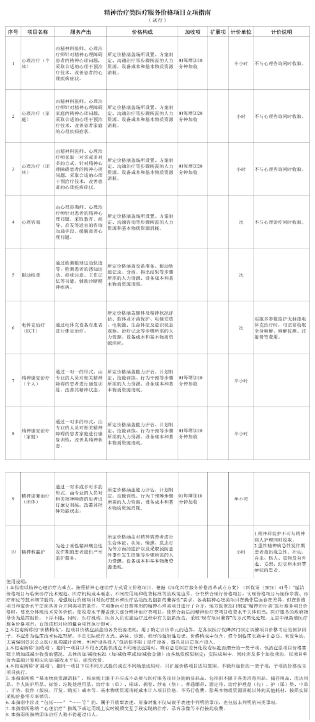 国家医保局于2024年11月19日发布了《精神治疗类医疗服务价格项目立项指南(试行)》,参考2023年版医疗服务项目技术规范,将现行精神治疗类价格项目映射整合为10项。综合来看,精神治疗类医疗服务价格项目为三大类。第一类是心理咨询与心理治疗,共有四项,即个体心理治疗、家庭心理治疗、团体心理治疗、心理咨询;第二类是精神康复治疗,共有三项,即个人精神康复治疗、家庭精神康复治疗、团体精神康复治疗;第三类是特殊检查与治疗,共有三项,即眼动检查、电休克治疗、精神科监护。其中第一类的个人、家庭与团体心理治疗明确规定由精神科医师和心理治疗师针对精神障碍患者个人或家庭的精神心理问题,采取合适的心理干预技术 ,改善患者或患者家庭的心理疾病症状。